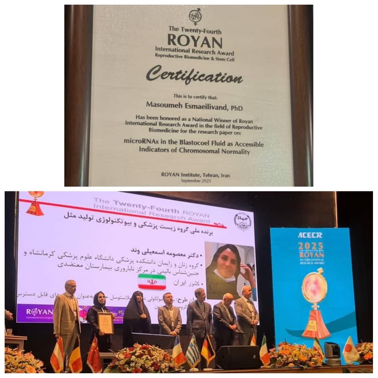 دکتر معصومه اسمعیلیوند، عضو هیأت علمی دانشگاه علوم پزشکی کرمانشاه، در بیست و چهارمین جایزه بینالمللی تحقیقاتی رویان (RIRA 2025) موفق به کسب عنوان «برنده ملی» گردید.